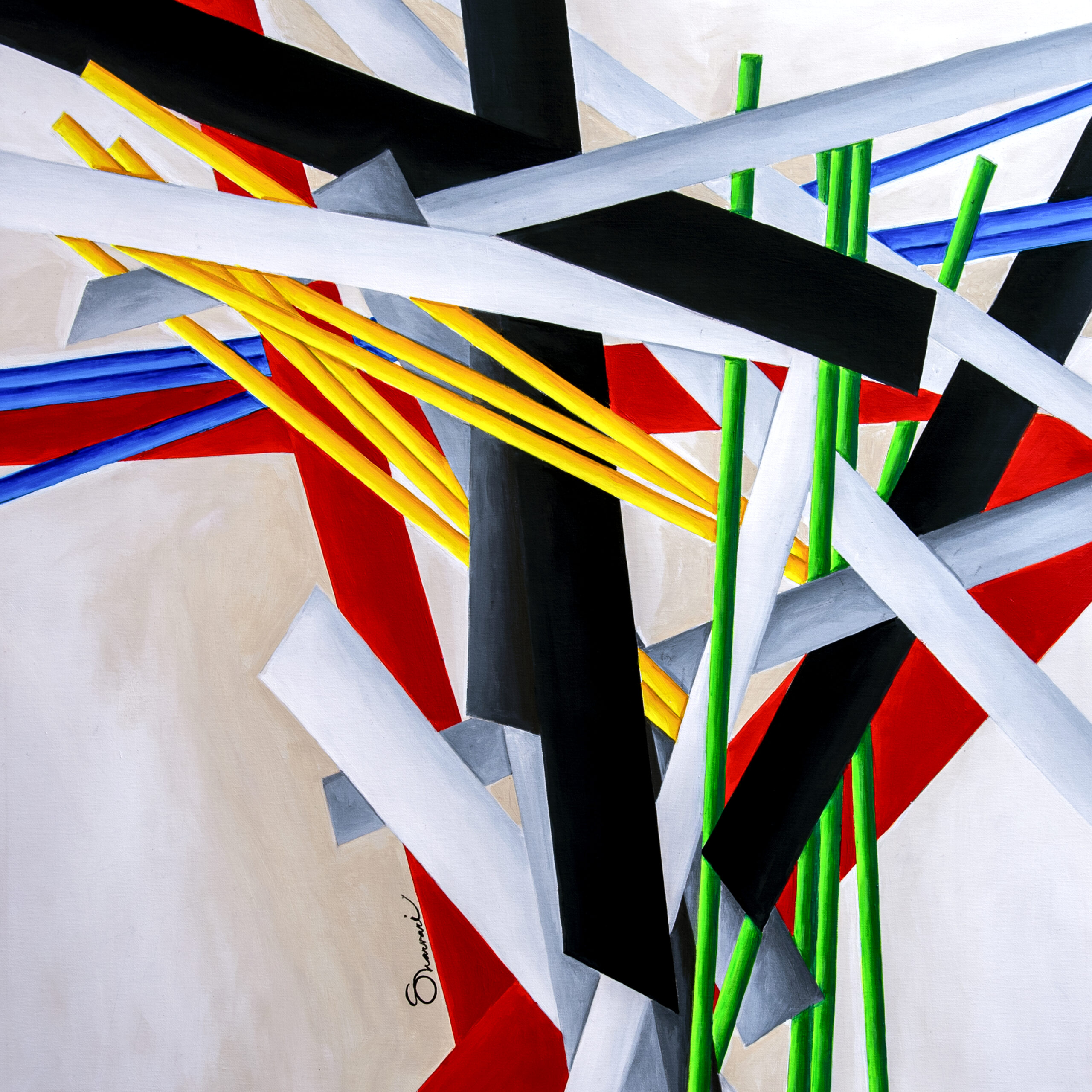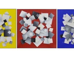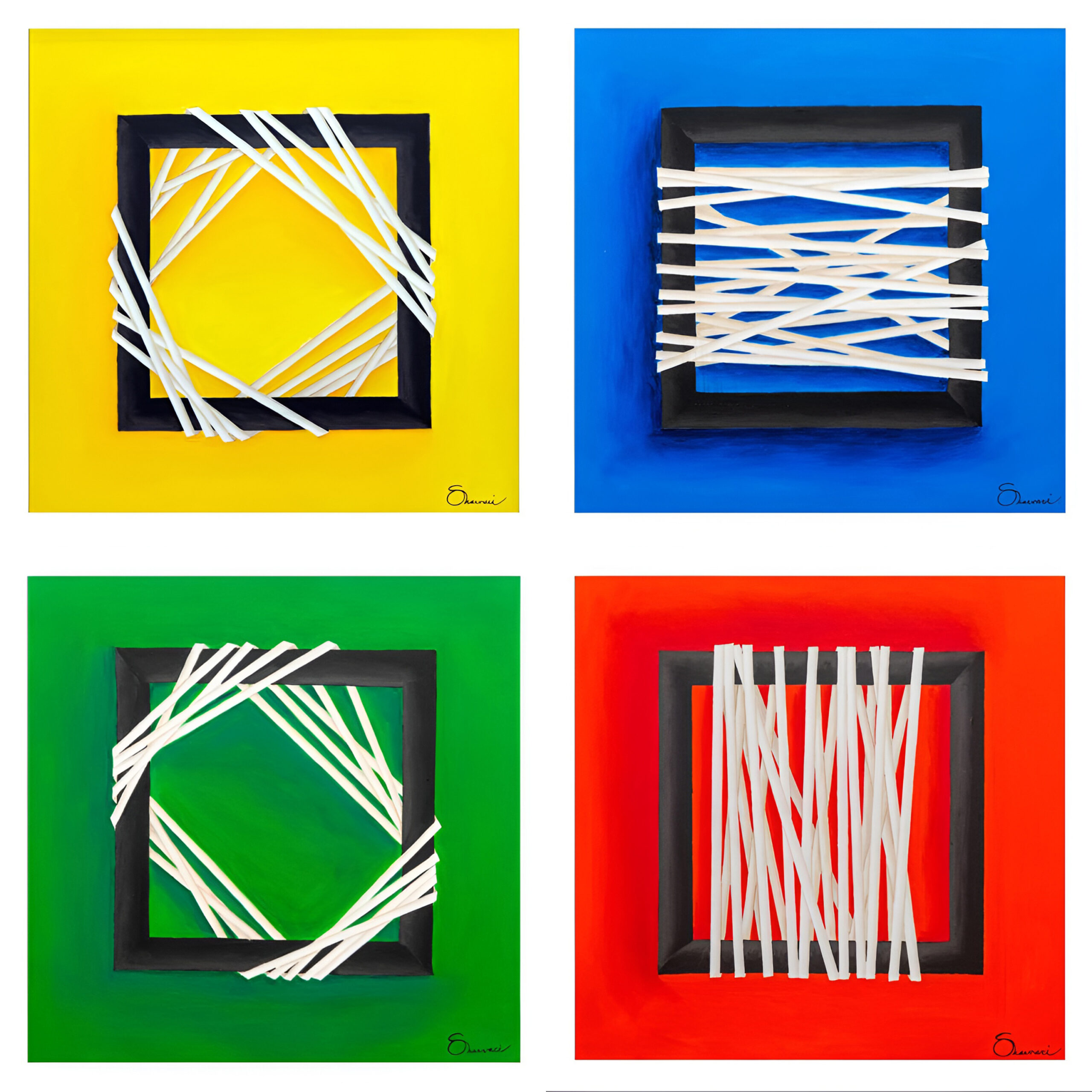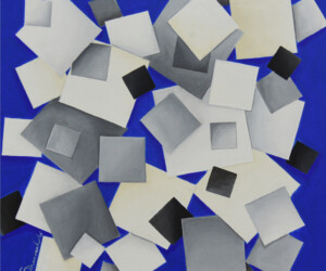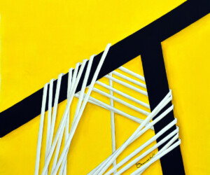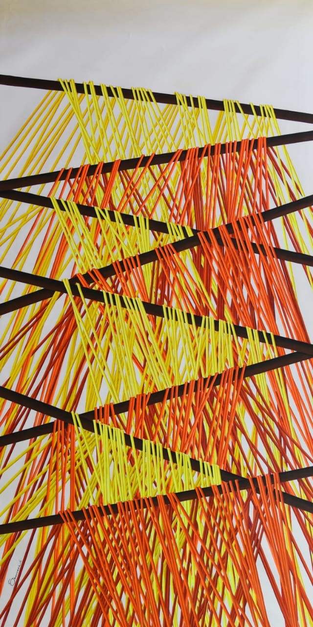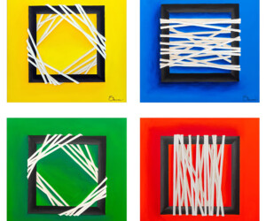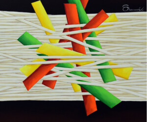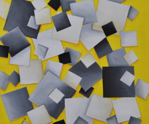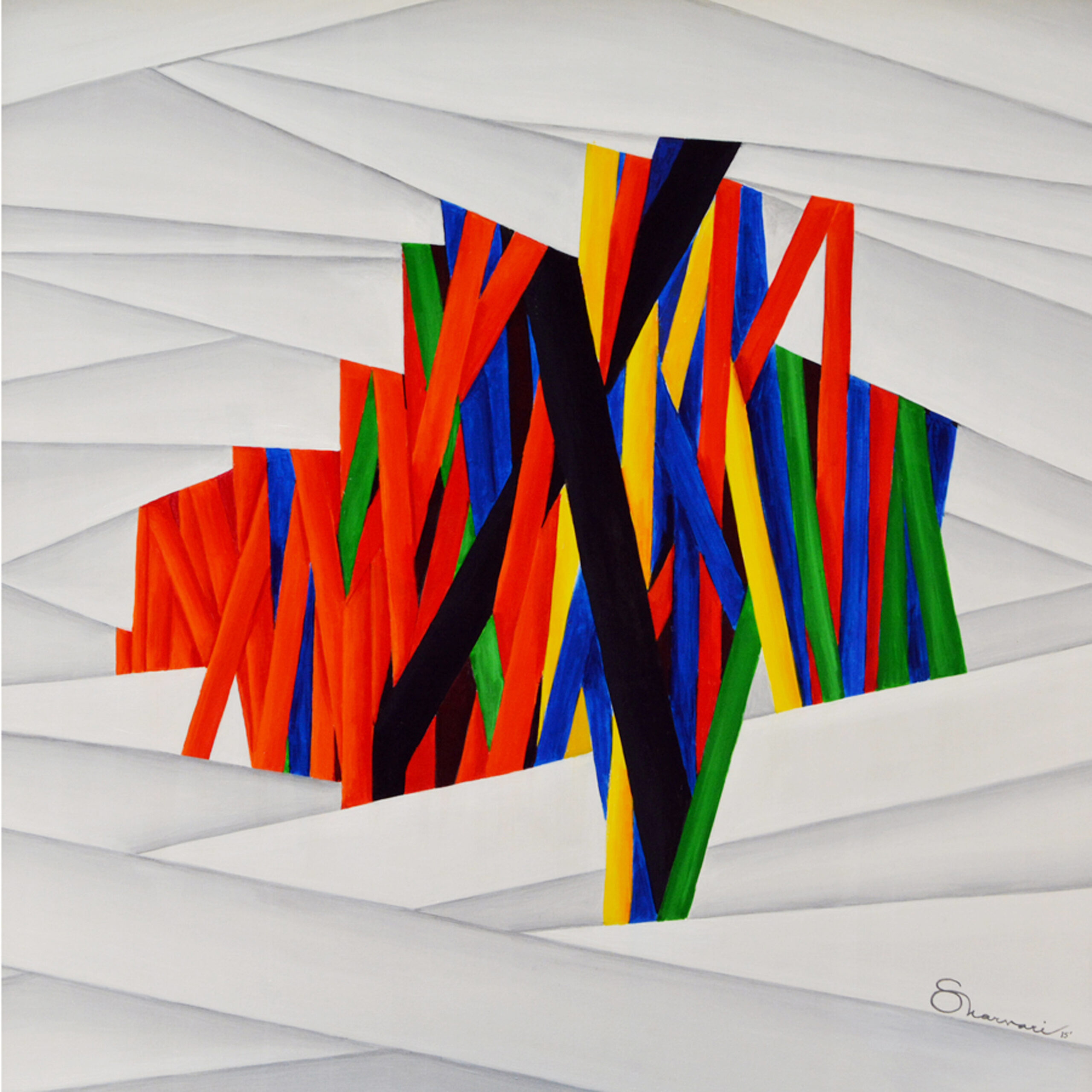 In the geometrical abstract series, Sharvari explores the identity of her art through color, balance and symmetry. Her architectural background is noticed in the dizzying compositions of her contemporary series. Using a strict geometric language, limited color palette yet consistent compositional format, she achieves a remarkable diversity within narrow framework. The bold and primary colors provide a rich contrast to the somber predominant blacks, greys and white and adds weight and movement to the paintings.